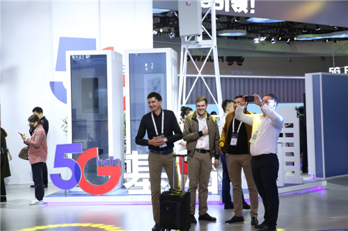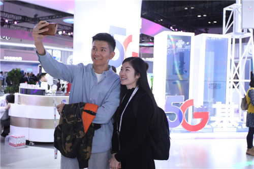 跟5G基站合个影,靓丽的中国电信展台成为众多参观者的自拍热点